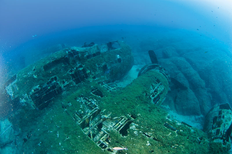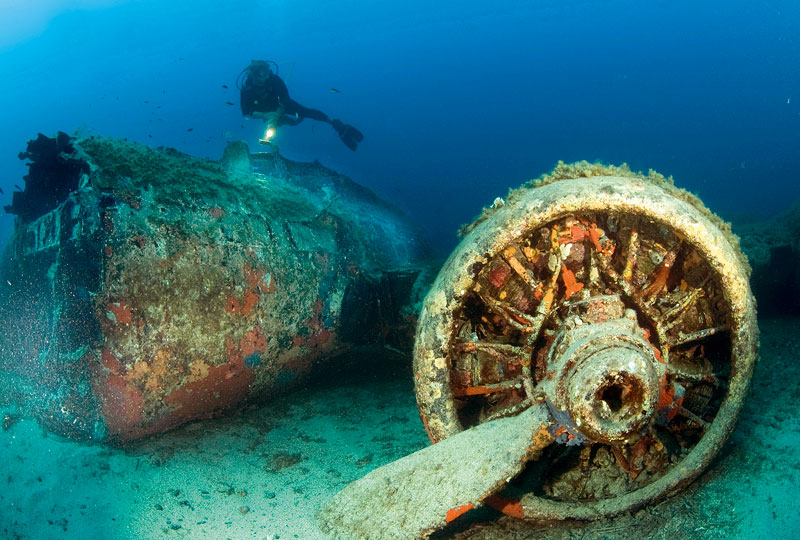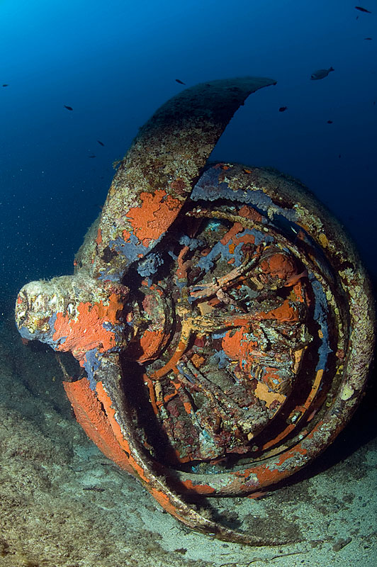 Vi har åkt i bara fyra minuter med gummibåten från dykcentret Castille Plongeé. Då stannar båten. Jag tänker att det måste vara för att släppa av de andra dykarna. De ska göra ett grunt dyk längs klipporna nedanför citadellet som tronar över Calvi. Men nej. Vi ska i vattnet allihop. Tillsammans med en holländare och min korsikanske guide Christophe ska vi dyka på vraket efter en B-17 – ”Flying Fortress”. Jag har dykt på en del flygplansvrak förr. Men det här är det största. Därför går jag ner med viss spänning och viker ut blixtarmarna på kameran. Sikten är bra. Ändå skulle jag ha föredragit att dyka närmare mitt på dagen. Nu har det dragit ut en bit frampå eftermiddagen. Solen kommer inte att tränga ner så bra på 28 meter. Där lade sig maskinen under ett försök att nödlanda 1942.