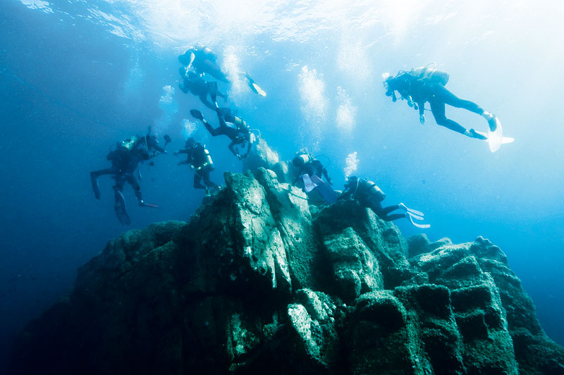 Landskapets bergighet fortsätter ner under havsytan runt Korsika. Klippor, klyftor, raviner och lodräta väggar väntar på att bli utforskade. I stället för med macchia är klipporna på bottnen vackert dekorerade med koraller och spongier. De ger sceneriet tjusiga och nästan tropiska färger.