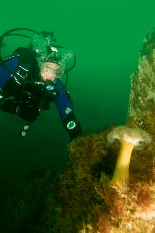 Jag känner att jag är på väg upp. Släpper ut luft ur västen. Även ur dräkten. Ändå stiger jag. Har jag tagit för lite bly? Jag räknar efter. Det kan inte stämma. Visserligen dyker jag i en tjock torrdräkt med pösigt underställ och vi befinner oss i en salt fjord. Ändå borde blyet räcka. Nå – jag får ordning på avvägningen och inriktar mig på att ta fler bilder. Men – vad är det som drar så hårt uppåt? Jag ligger ju och sprattlar runt som en nybörjare på första torrdräktsdyket. Så går det plötsligt upp en talgdank.