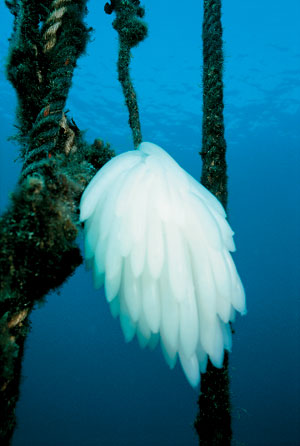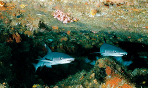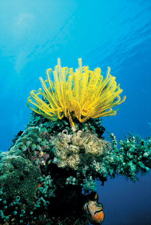 Vattnet är mörkt då vi dyker tätt inpå en klippvägg, som skuggar solen. En märklig ljusslöja breder ut sig i vattnet och ger en högtidlig stämning, som understryks av de bisarra kreatur vi ser.