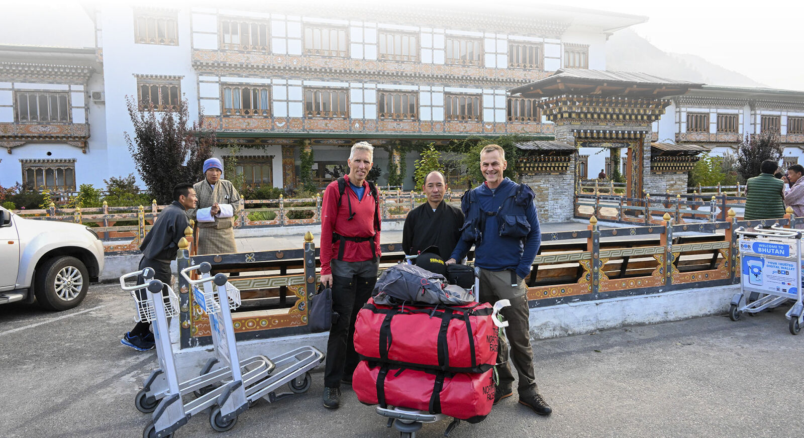Vi flög från Köpenhamn via Bangkok till Bhutans internationella flygplats i Paro. Flygplatsen ligger på 2 235 meters höjd, omgiven av berg på upp till 5 500 meter – en av världens mest utmanande inflygningar.