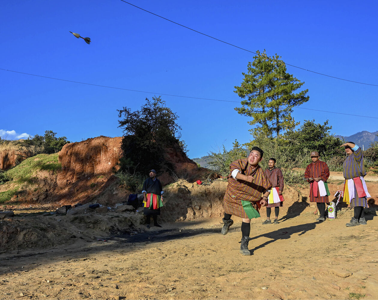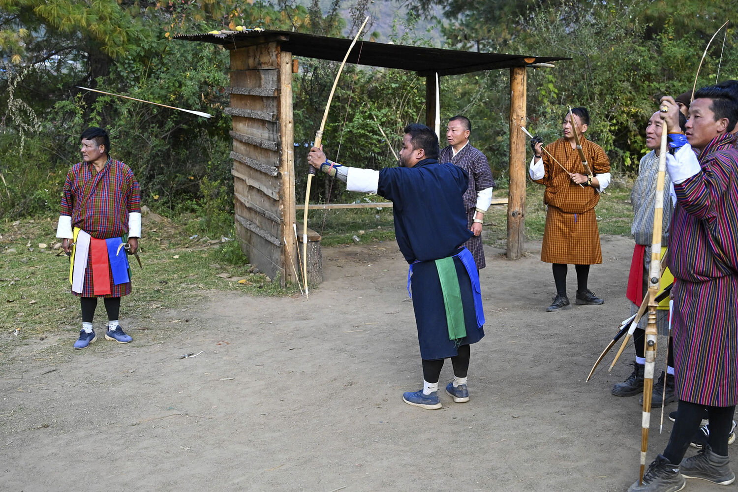 Utanför flygplatsen väntar vår guide, Dorji, iklädd nationaldräkt. I Bhutan är det obligatoriskt att bära nationaldräkt när man arbetar, går i skola – eller utövar landets nationalsport, bågskytte.